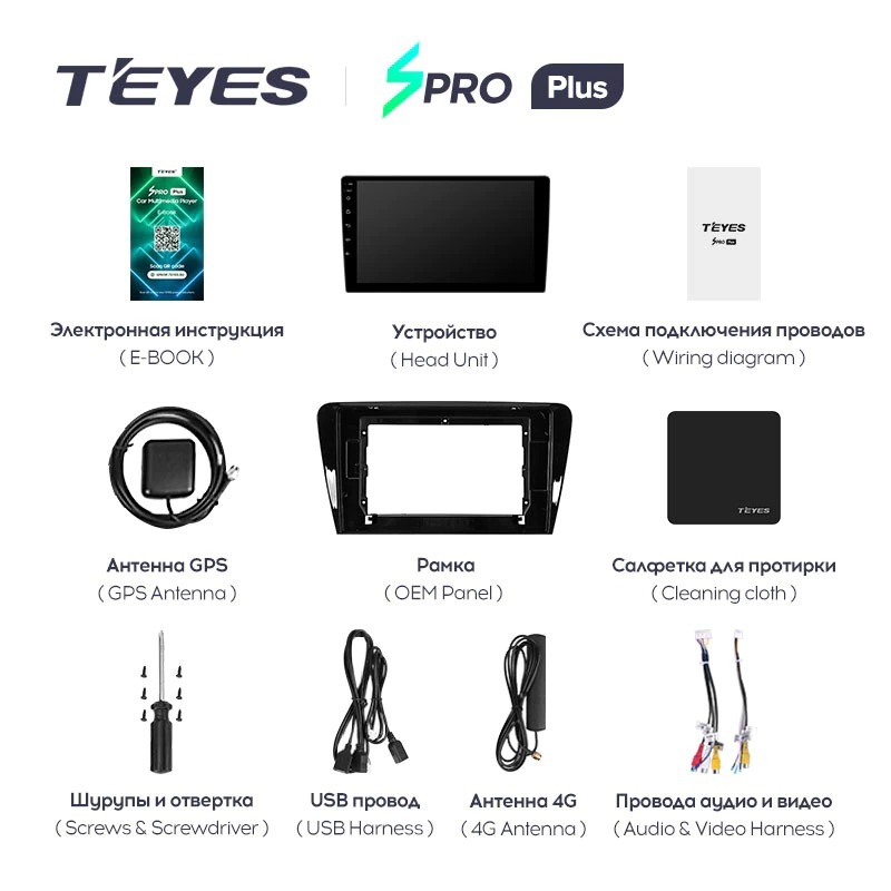 Планшет, Рамка, Электронная инструкция, Схема подключения проводов, GPS антенна, 4G антенна, Салфетка, Отвертка и шурупы, Провода аудио и видео, USB провод